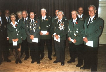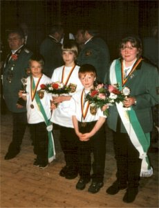 Unter großer Beteiligung feierte ganz Steina am Pfingstsonntag das Volks und Schützenfest. Höhepunkt war die Proklamation des Schützenkönigspaars 2001. Es heißt Carlo Ronge und Renate Böttinger. Bestfrau bzw. -mann wurden Kerstin Lauenstein und Jörg Schattenberg, der zugleich auch Gewinner des zum ersten Mal vergebenen "Eva-Lauenstein-Gedächtnis-Pokals" ist. Das Bestmannpaar bei den Jugendlichen bilden Patrik Ronge und Jenifer Laib. Neuer Schülerkönig ist Christopher Lauenstein; seine Königin heißt Svenja Ronge. Volkskönig wurde Bodo Sieg. Hier die neuen Würdenträger mit der Vereinsführungn.