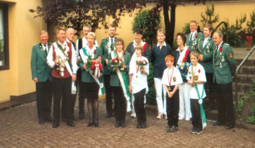 Unter großer Beteiligung feierte ganz Steina am Pfingstsonntag das Volks und Schützenfest. Höhepunkt war die Proklamation des Schützenkönigspaars 2001. Es heißt Carlo Ronge und Renate Böttinger. Bestfrau bzw. -mann wurden Kerstin Lauenstein und Jörg Schattenberg, der zugleich auch Gewinner des zum ersten Mal vergebenen "Eva-Lauenstein-Gedächtnis-Pokals" ist. Das Bestmannpaar bei den Jugendlichen bilden Patrik Ronge und Jenifer Laib. Neuer Schülerkönig ist Christopher Lauenstein; seine Königin heißt Svenja Ronge. Volkskönig wurde Bodo Sieg. Hier die neuen Würdenträger mit der Vereinsführungn.